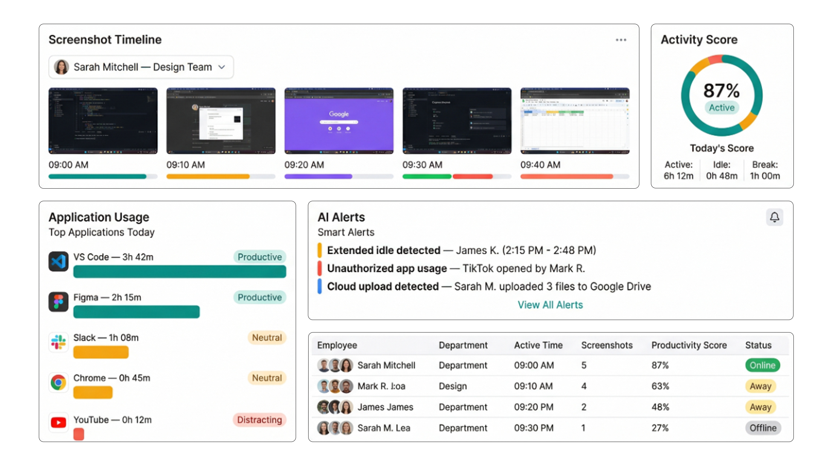 Track what your team is working on with activity monitoring and automated screenshots — no more guesswork.