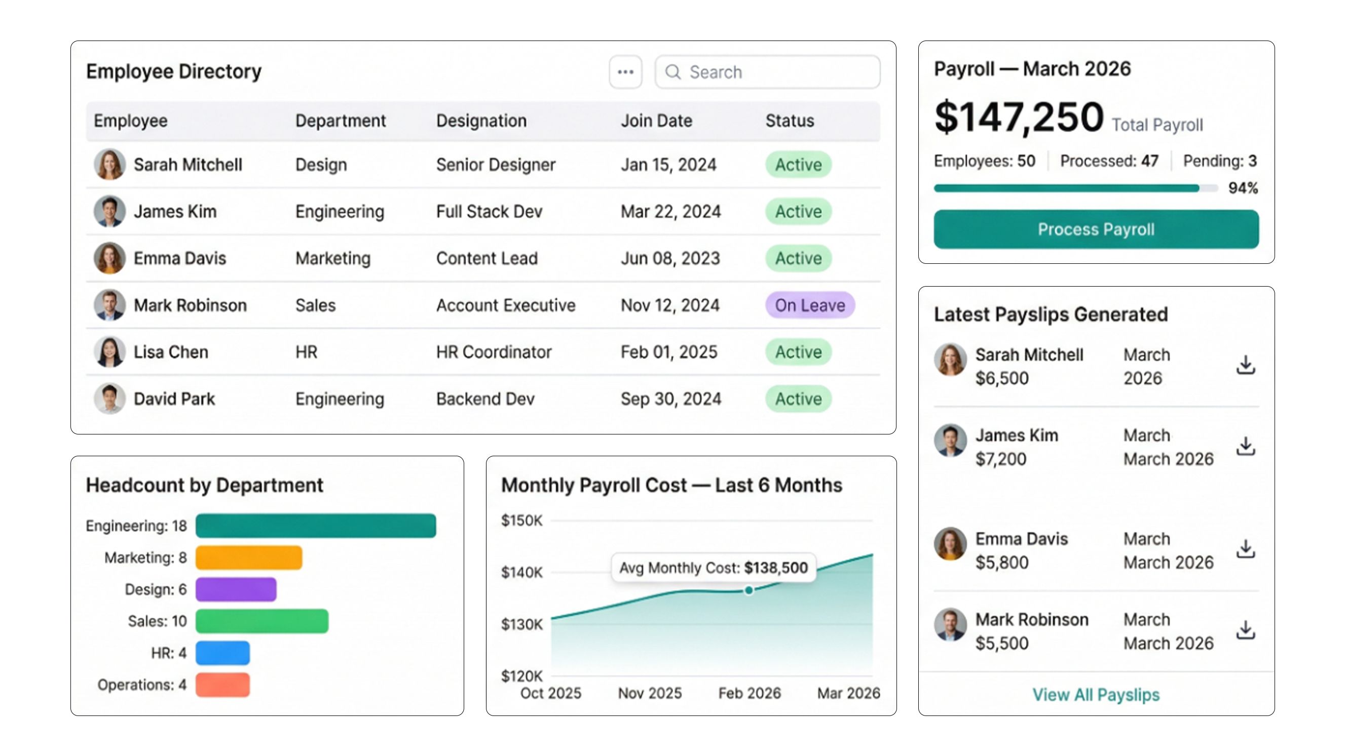 Manage employee records, attendance-based payroll, and salaries — all in one place.