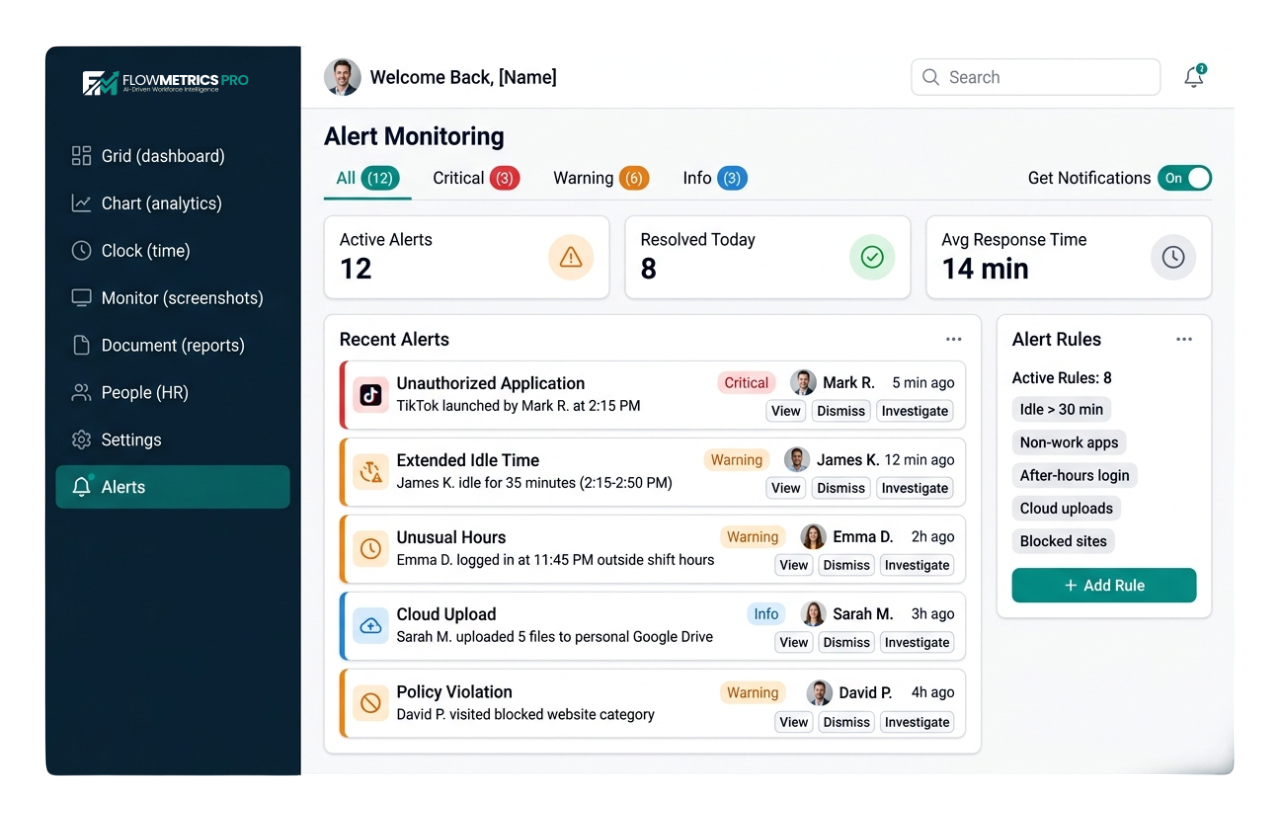 Unusual behavior patterns and policy violations are automatically flagged.