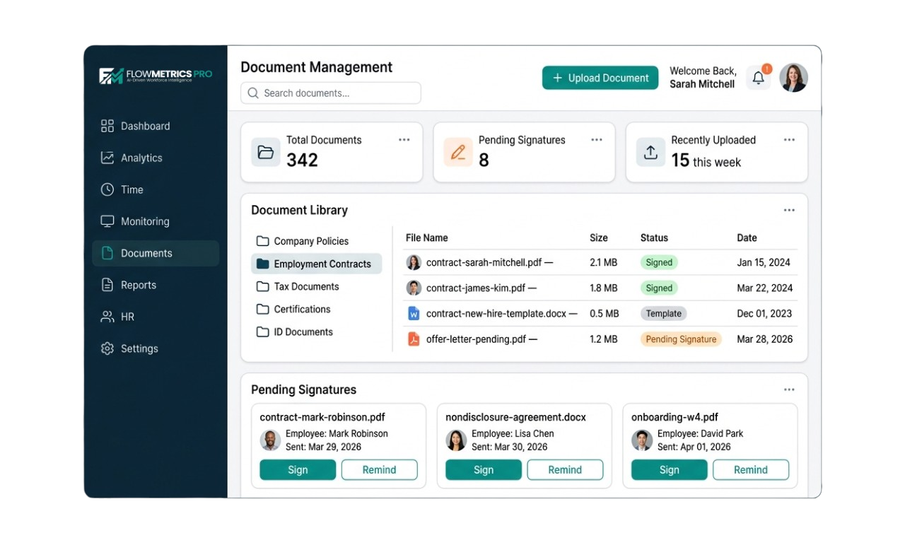 Digital signing and employee document storage. Manage contracts, policies, and HR documents with secure storage and electronic signatures.