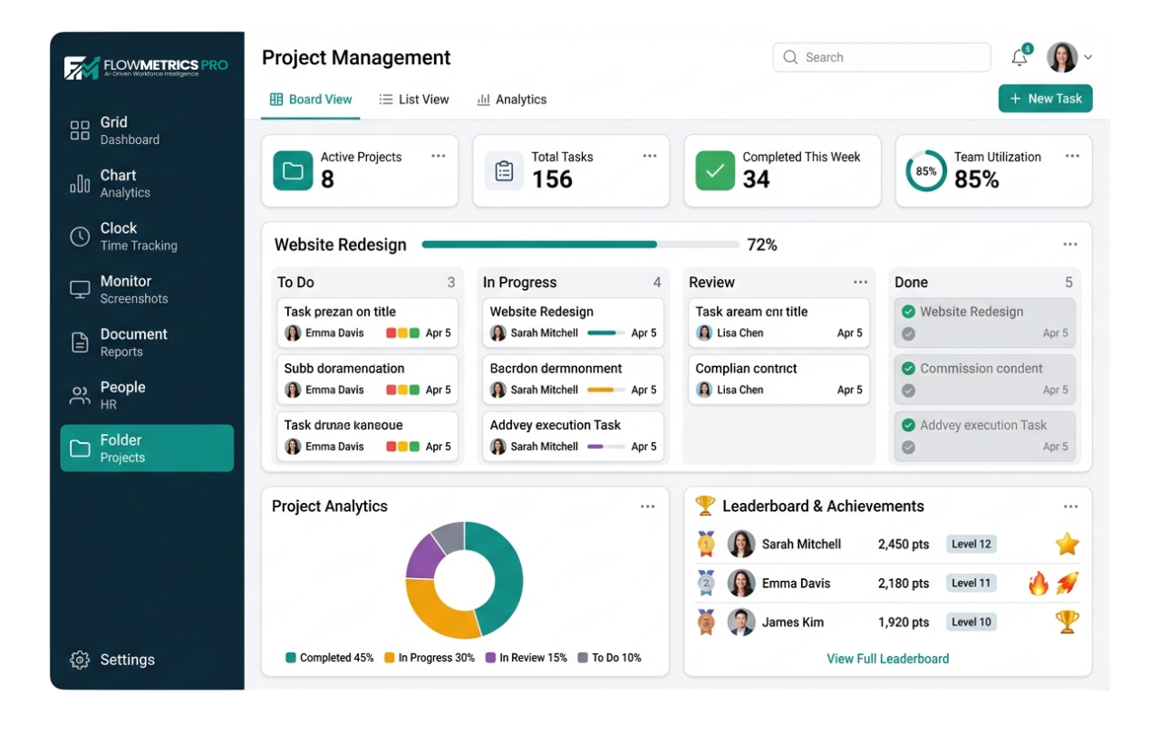 Set up projects with team members, milestones, and deadlines. Choose board or list view.